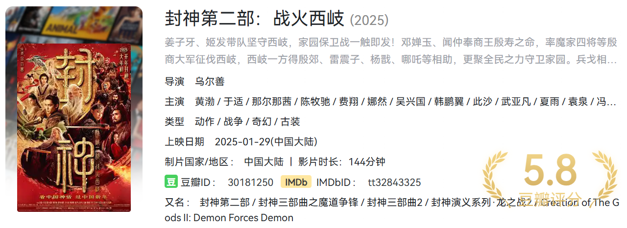 封神第二部:战火西岐 ( 2025年上映 )【2K超清画质 + 影院杜比音效】黄渤主演 栏目:电影区 作者:nantuziyuan123 时间:2025-12-03 20:57:10    **简介:** 这是2023年封神第一部的续作,非常好看,目前已出超清画质视频资源,纯2K,具有跟影院一样的杜比音效。 > [!success] **资源链接** > https://pan.quark.cn/s/fc6be1385667 版权声明:本站不存储任何实质资源,该帖为发布的网盘链接介绍帖。如您认为本站任何介绍帖侵犯了您的合法版权,请联系站长 ( 微信:titanluo87) 进行投诉,我们将在确认本文链接指向的资源存在侵权后,立即删除相关介绍帖子!