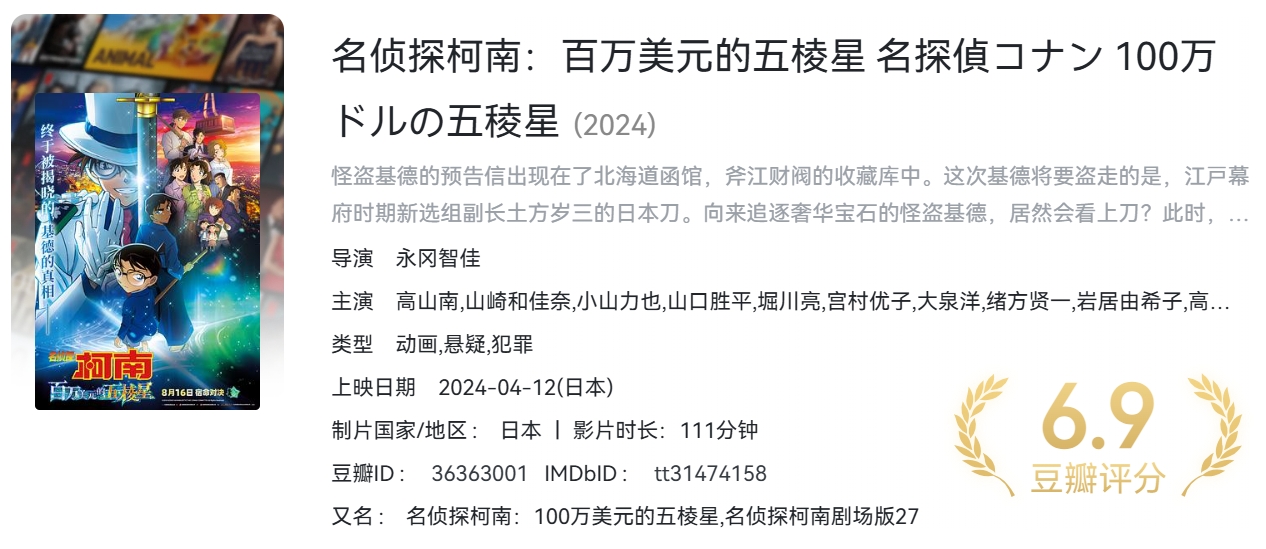 名侦探柯南:百万美元的五棱星(2024)【蓝光原盘REMUX】 内封简繁特效字幕【17.9G】 栏目:动漫区 作者:nantuziyuan123 时间:2025-12-12 20:52:26   **简介:** 怪盗基德的预告信出现在了北海道函馆,斧江财阀的收藏库中。这次基德将要盗走的是,江戸幕府时期新选组副长土方岁三的日本刀。向来追逐奢华宝石的怪盗基德,居然会看上刀?此时,被称作西部名侦探的服部平次和柯南一行人,也因为剑道大会来到了函馆,在基德执行预告的当日,平次看穿了基德的伪装并对其穷追不舍!同一时间,一具尸体在函馆仓库街被发现,尸体的胸口有一个十字伤口。搜查中,出现了一位被叫做“死之商人”的活跃于亚洲一带的美籍日裔军火商。这个人一直在寻找斧江家初代家主藏在函馆的宝藏。斧江家江戸幕府战争时代深耕军需产业,传说那宝藏是能扭转幕末纷争的强力武器,而这宝藏似乎和基德追逐欲盗取的刀有着千丝万缕的联系。在基德瞄准刀的同时,有一位剑士也在向基德逼近…… > [!success] **资源链接** > https://pan.quark.cn/s/043956263fb5 版权声明:本站不存储任何实质资源,该帖为发布的网盘链接介绍帖。如您认为本站任何介绍帖侵犯了您的合法版权,请联系站长 ( 微信:titanluo87) 进行投诉,我们将在确认本文链接指向的资源存在侵权后,立即删除相关介绍帖子!
