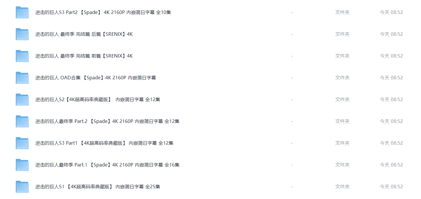 《进击的巨人》全系列完结【顶级4K典藏版】 4K超高码率 单集8G 附OVA合集 【内嵌简日双语特效字幕】 814G 栏目:动漫区 作者:nantuziyuan123 时间:2025-12-12 20:46:20    **简介:** 《进击的巨人》(日语:進撃の巨人)是一部日本的黑暗奇幻动画连续剧,改编自漫画家谏山创的同名漫画。 故事发生在虚构世界,人们生活在由三道层层包围的巨大围墙所构成的世界中,围墙外面有着无数以人类为食的巨人。故事围绕着主人公艾伦·耶格尔和他的朋友三笠·阿克曼以及阿尔敏·阿诺德的经历展开。三人原本平静的生活因某日巨人破墙而入而随之改变,之后经历苦难的他们加入了专门对付墙外巨人的调查兵团。艾伦和他的朋友们发誓要将这世界上的巨人赶尽杀绝,并在之后的历练中成长为与巨人作战的精锐士兵。然而随着艾伦被发现也是巨人之一后,这个世界背后的真相被一点点揭开。故事的主题也由最初的热血复仇逐渐变成对世间的人性和正义的复杂解读。 本作在剧情、作画与配乐各方面出色的表现,使其在日本国内与海外的众多影视评论网站上获得接近满分的评价,**被认为是近年日本动画的代表作之一**。 > [!success] **资源链接** > https://pan.quark.cn/s/e3d547b088e3 版权声明:本站不存储任何实质资源,该帖为发布的网盘链接介绍帖。如您认为本站任何介绍帖侵犯了您的合法版权,请联系站长 ( 微信:titanluo87) 进行投诉,我们将在确认本文链接指向的资源存在侵权后,立即删除相关介绍帖子!